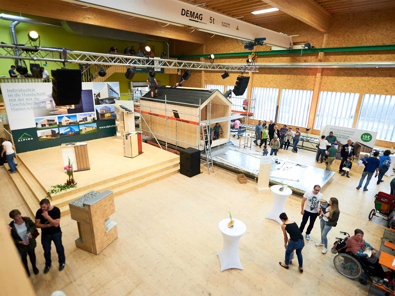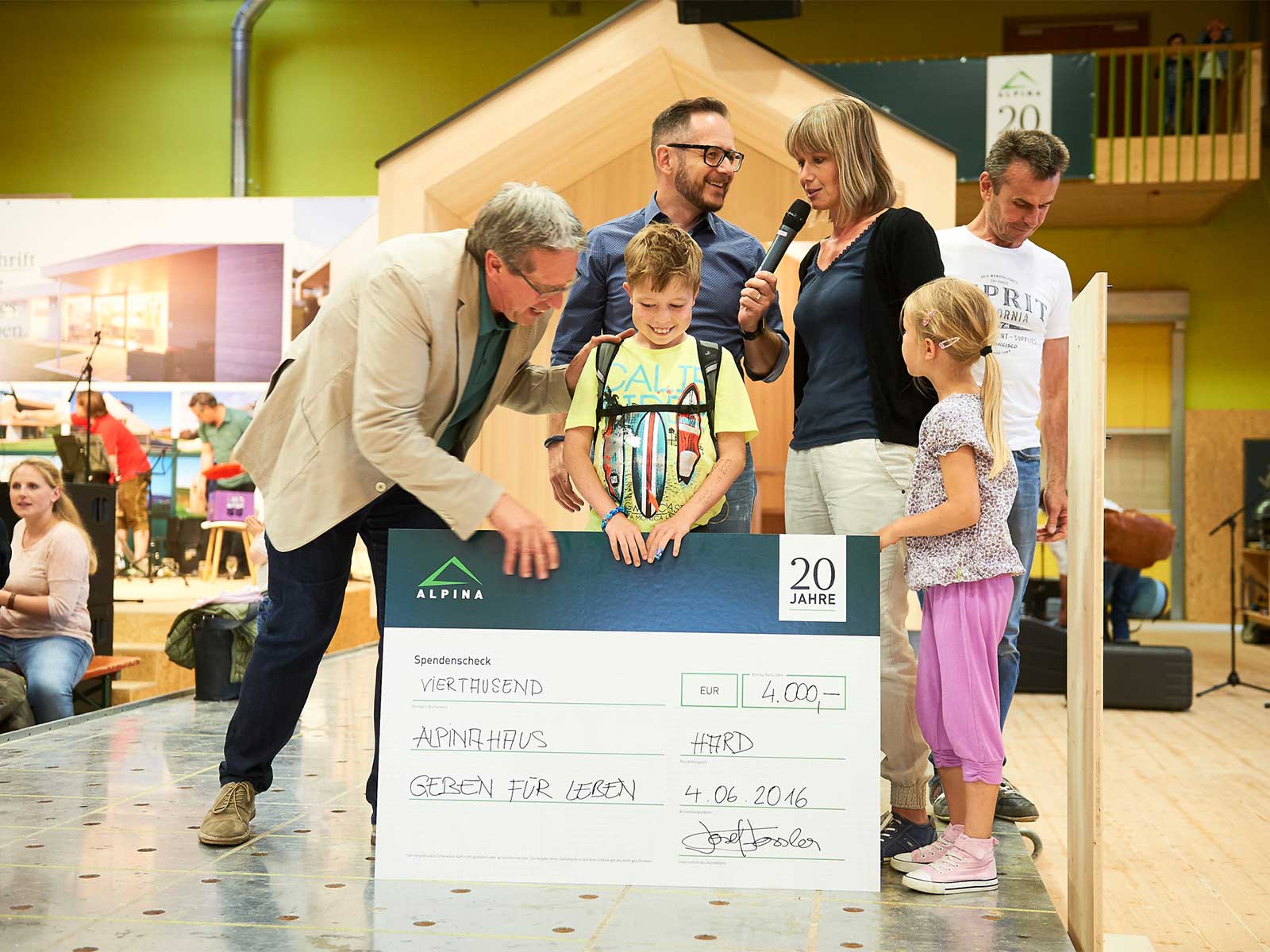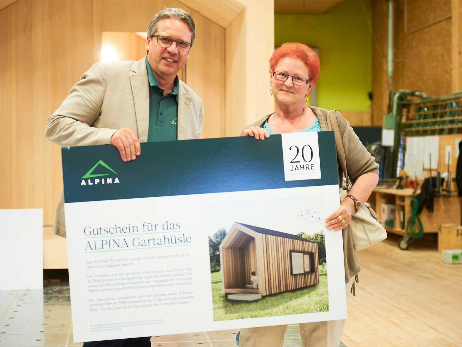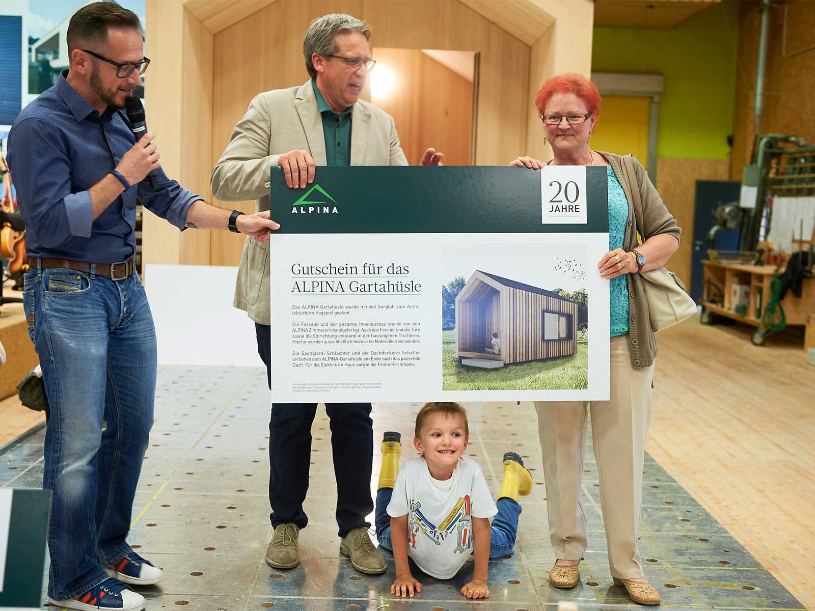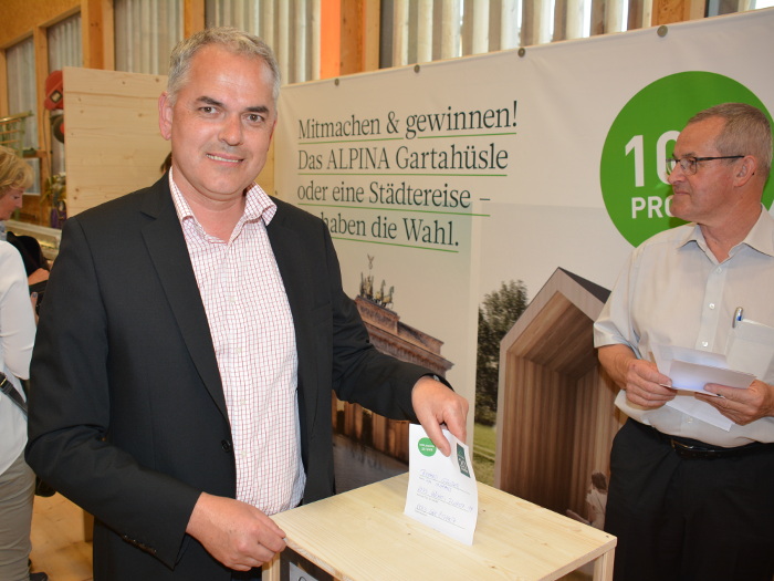 Highlight des Tages war der Bau unseres „ALPINA Gartahüsle“, das wir live im Laufe des Tages errichteten und am Abend verlosten. Das Gartenhaus fand seinen neuen Besitzer in Fußach und der Erlös der Verlosung in Höhe von 4.000 Euro überreichten wir dem Verein „Geben für Leben“.